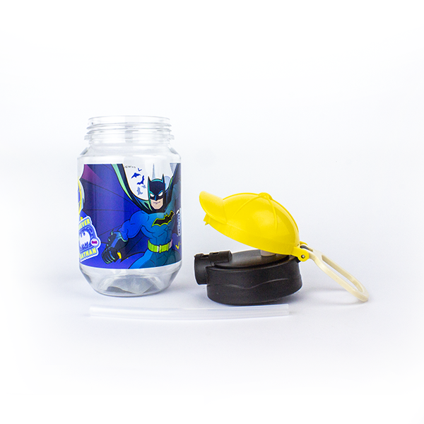 غطاء أمان وماصة عملية: غطاء الزجاجة آمن ومحكم لمنع التسريب، وفيها ماصة مرنة علشان الشرب يكون سهل وآمن للأطفال، خصوصًا أثناء اللعب أو الجري.