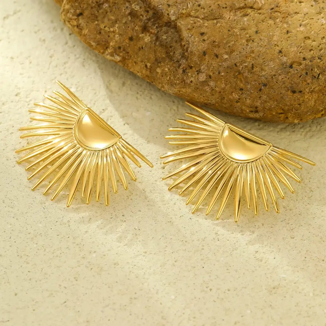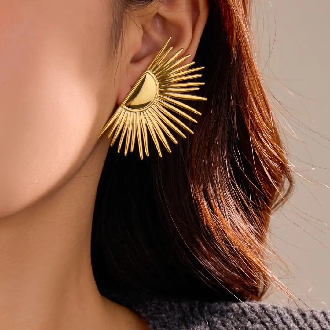 أقراط شمسية أنيقة مصنوعة من معدن بحركة ذهبية عالية الجودة. تضيف هذه الأقراط المميزة لمسة من الأناقة والسحر لمظهرك.