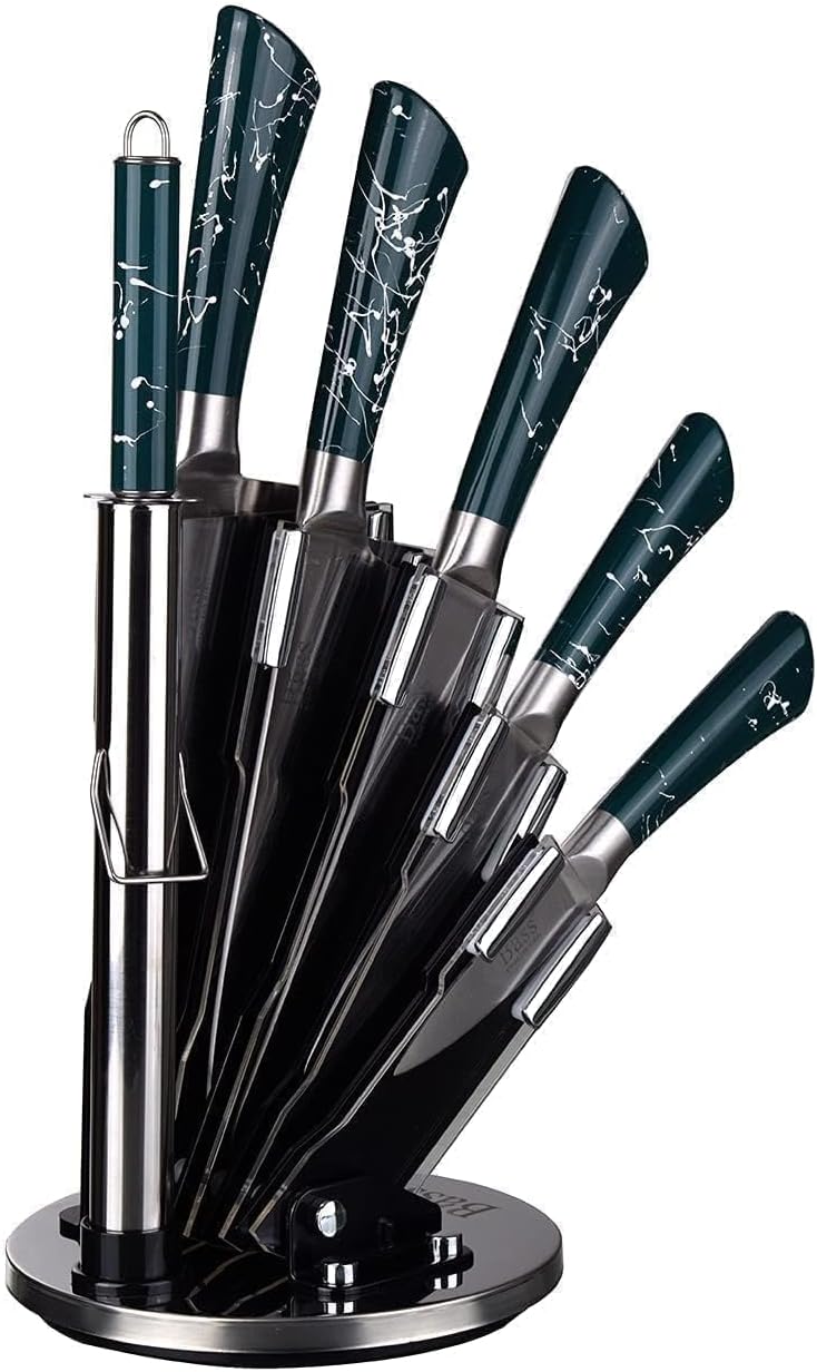 مجموعة سكاكين مطبخ من باس مكونة من 7 قطع مع حامل دوار طقم سكاكين مطبخ مكون من 7 قطع: تتميز بشفرات عالية الجودة مصنوعة من الستانلس ستيل.