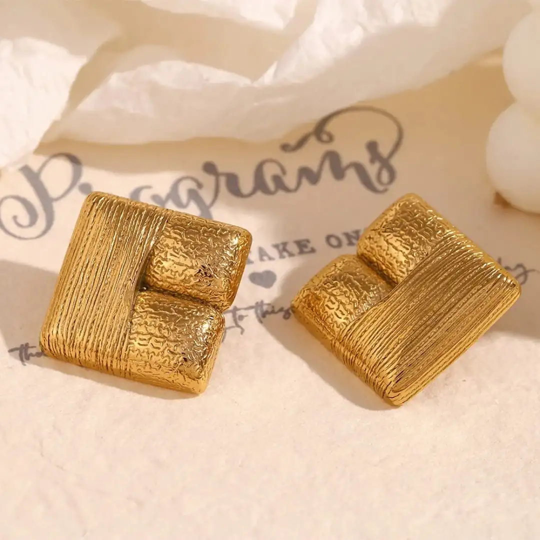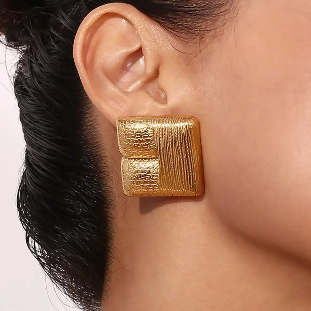 أقراط مصممة بشكل مربع أنيق مصنوعة من معدن ذهبي اللون عالي الجودة. تتميز بنقوش دقيقة وخطوط متوازية تضيف لمسة من الرقي والأناقة.