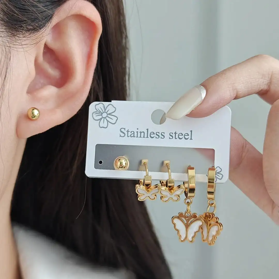 طقم أقراط أنيق مصنوع من الفولاذ المقاوم للصدأ عالي الجودة، بتصميم فراشة أنثوي وجذاب. يشمل حلقات، دوائر، وأقراط فراشة متدلية.